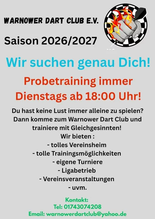 Vater Markus spielt seit vielen Jahren Dart in seinen eigenen vier Wänden mit Freunden und seit kurzer Zeit auch mit Sohnemann Fabian. Beide meldeten sich beim Probetraining und nahmen an unseren Turnieren im Vereinsheim teil. Sie haben sofort gefallen gefunden unter Gleichgesinnten zu trainieren und zu spielen. Fabian wird unser Jugendteam unterstützen und Vater Markus wird höchstwahrscheinlich in der neuen Saison im Ligabetrieb einsteigen. Wir vom Warnower Dart Club freuen uns auf die Entscheidung der beiden und wünschen beiden viel Spaß und maximale Erfolge 💪 . Der Warnower Dart Club e.V. freut sich immer auf neue Gesichter und rufen jeden Dienstag ab 18:00 Uhr zum Probetraining.